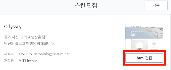 우선 html을 편집해야 한다. 블로그 설정의 사이드바에서 스킨 편집을 선택한다. 그리고 오른쪽 상단에 html 편집을 클릭하면 된다.